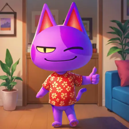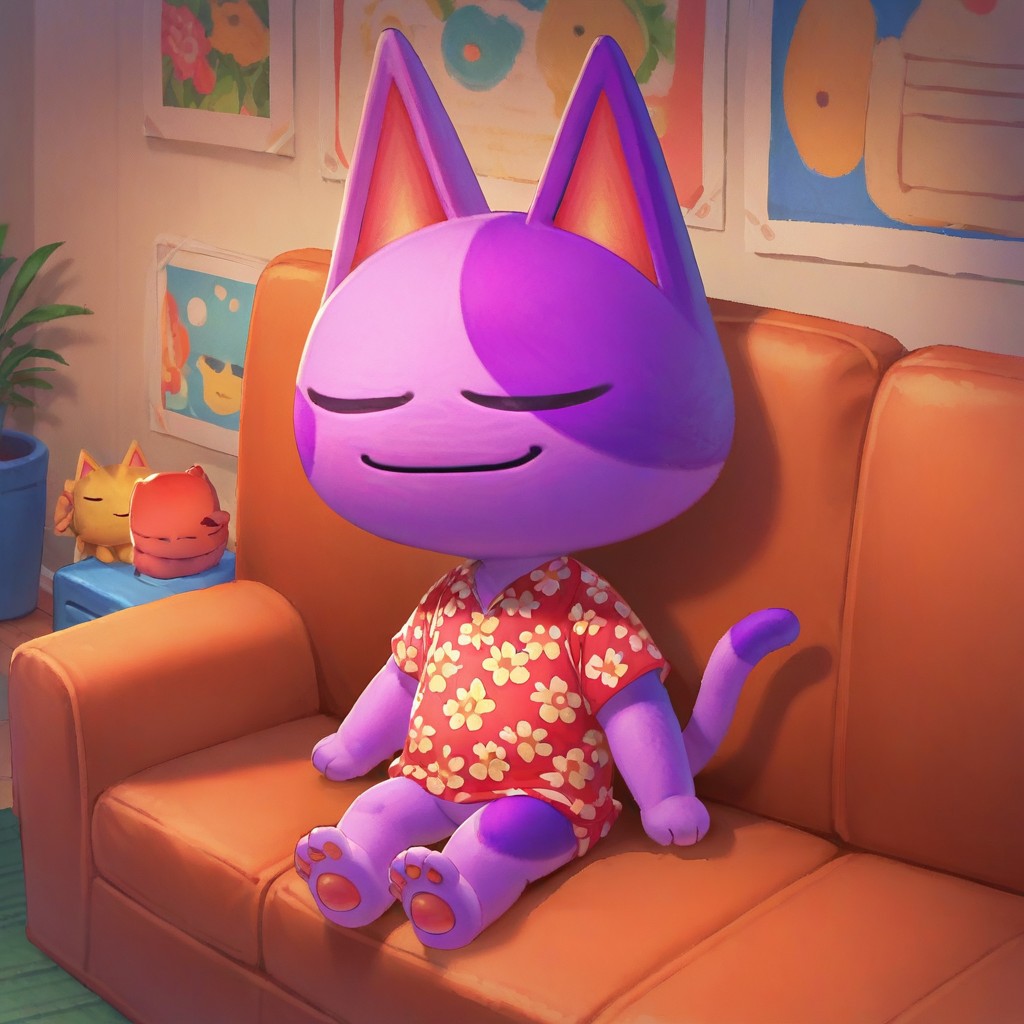 male, furry male, anthro, solo, cat, purple fur, two-tone fur, yellow sclera, black pupils, pointed ears, paw pads, tail