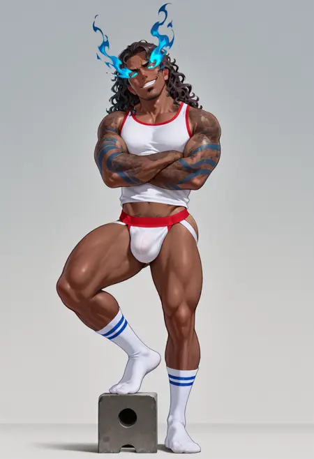 This LoRA is based on the Coyote Jocks Cotton Ringer Collection, including a shirt, tank top, briefs, jockstrap and socks in the colors black, blue, and red.