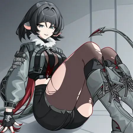| トレーニングワード | Base: Jane, short black hair, red-dyed long ponytail, blue eyes, rat ears, large breasts, コピーしました! Outfit: gray crop jacket, fur collar, red and black details, black shorts, ripped black pantyhose, gray and red boots, fingerless gloves, mechanical tail, tactical harness, tight high,コピーしました! |