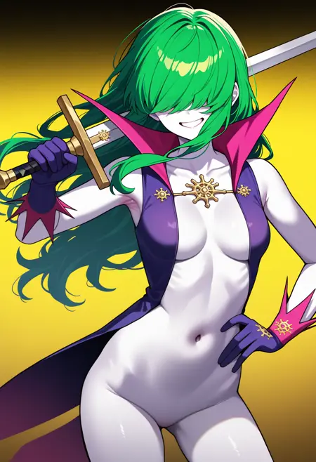 nmu, green hair, hair over eyes, long hair, white skin, purple vest, open vest, brooch, high collar, purple gloves, navel, coattails, purple boots
