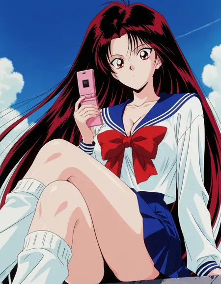 学校制服、セーラー服、シャツ、白シャツ、青いセーラーカラー、リボンタイ、赤いリボンタイ、青いスカート、プリーツスカート、ルーズソックス,