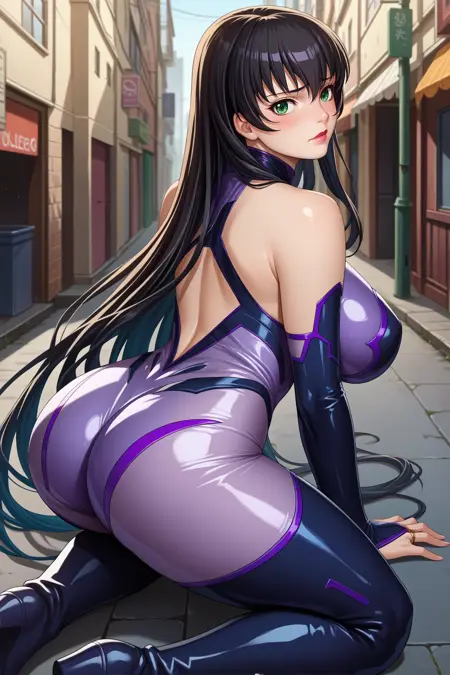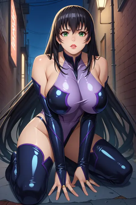 彼女の典型的な外見には "タートルネック、紫のボディスーツ、裸の肩、エルボーグローブ、ブライダルガントレット、輝く衣装、黒い手袋、黒いスパッツ、太ももブーツ" を追加してください。