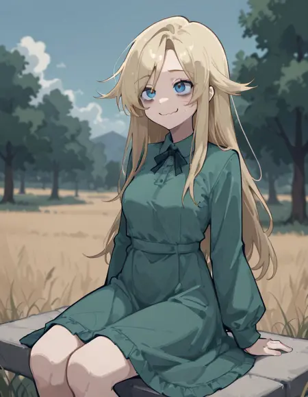 新しく追加されたOCですが、特に指定がなければ、彼女は通常緑のドレスを着ていることが想定されており、それが彼女の一番好きな服装です。彼女は落ち込み、疲れており、気分が滅入っています。この状態から彼女を救い出すのはかなり大変です。例の画像に見られるように、たとえ彼女に幸せな笑顔を求めてプロンプトを送っても、過去のトラウマ体験の影響で、いつでも崩れそうな表情になってしまいます。