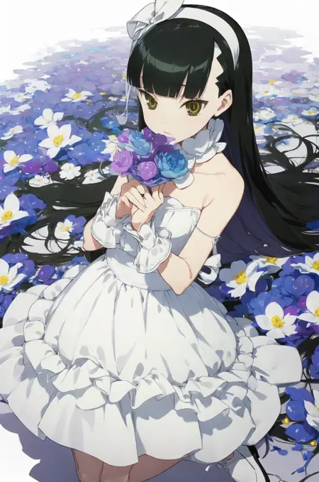 (white frilled leotard, white corset dress, center opening, white shoes, white hairband, white wrist cuffs, purple ribbon, white frilled collar, blue flowers on frilled collar),