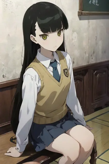 (school uniform, white shirts, blue skirt, cream yellow sweater vest, black loafers, red necktie),