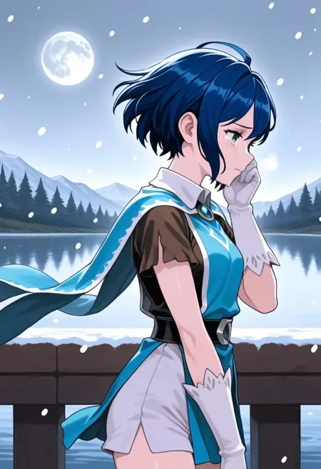fencer clothing, dual scarves, blue scarves, blue apron, puffy frills, side slits, thighs, thigh high boots,