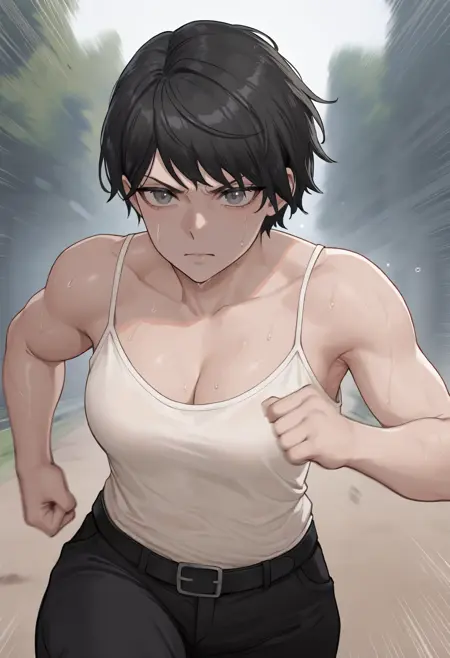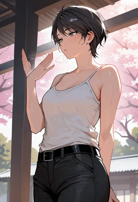 服装标签: 白色吊带背心,黑色腰带,黑色长裤,棕色鞋履