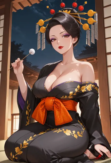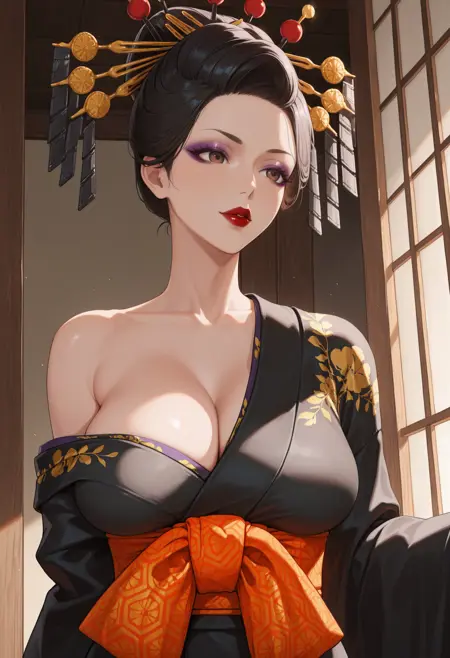 mdmm、茶色の目、黒髪、髪止め、髪飾り、化粧、赤い唇、片方の裸の肩、黒い着物、オレンジ色の帯、日本の服、大きな胸