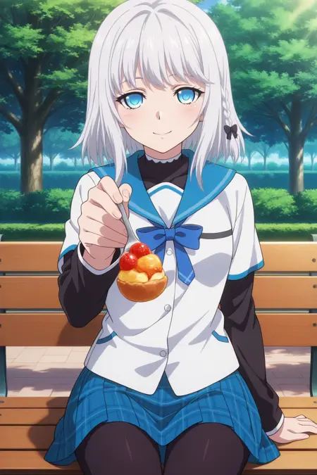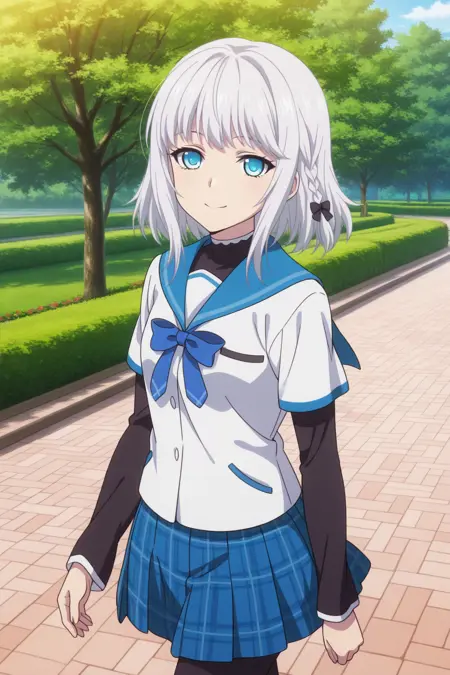 aakanon, 파란 눈, 흰 머리카락, 옆머리 비틀기, 검은 머리끈, 학교 교복, 파란 배색 칼라, 흰 셔츠, 파란 넥타이, 짧은 바깥 소매, 검은 긴 소매, 파란 치마, 체크무늬 치마, 검은 팬티스타킹, 애니메이션 색칠,