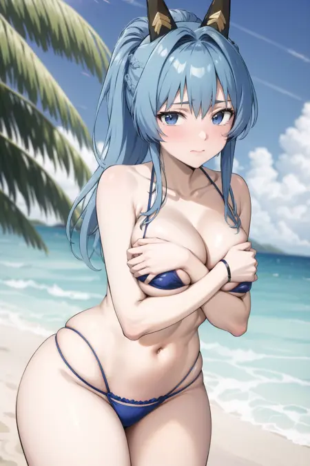 在负面提示中加入 透视、内衣 可让衬衫保持干燥;你也可以在提示中使用 敞开的衬衫 来在干燥衬衫下看到比基尼。可通过在负面提示中加入 假动物耳朵、头饰 来移除她头上的“东西”(不知为何物)。