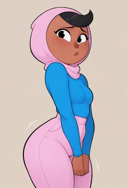 태그: zari, 검은 머리, 검은 눈, 갈색 피부, 분홍색 바지, 후드, 단발, 파란 셔츠