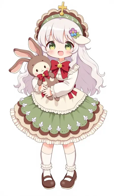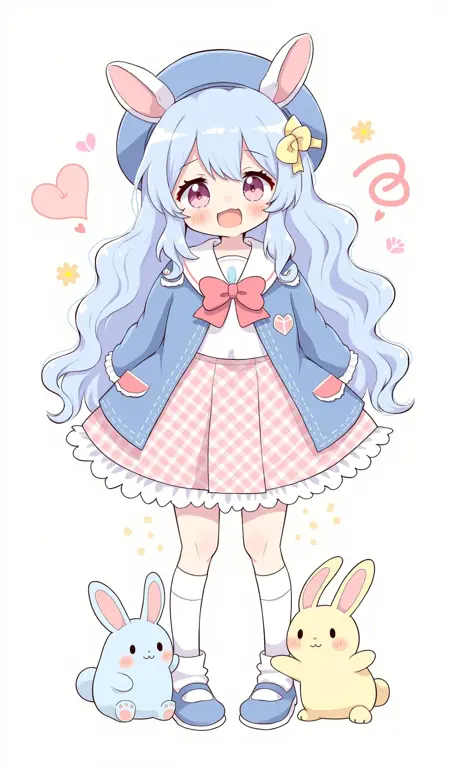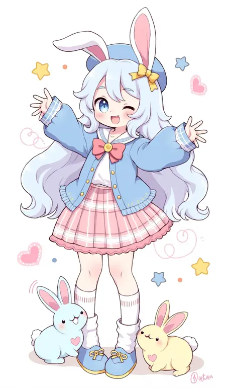 and white socks with blue shoes. The character also has a blue hat with bunny ears and a yellow ribbon. In the foreground
