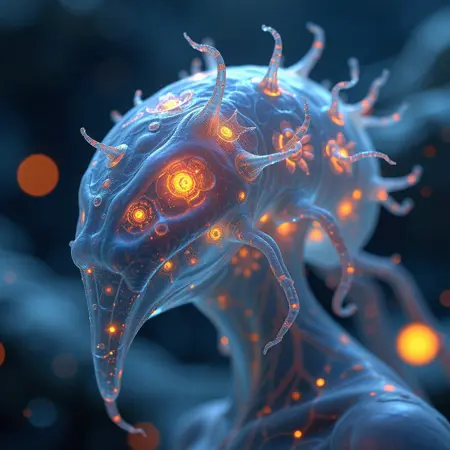 protozoa/bacteria/archaea/humanoid bioluminescence translucent scales, with no ear and nose 32k, 16k, 8k, masterpiece,