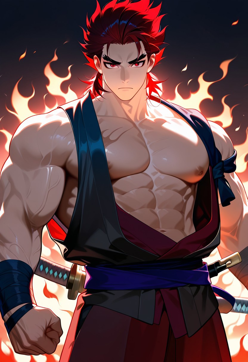 Prompt(kazama kazuki):Kazuk1, red hair, spiked hair, red dougi, manly, fingerless gloves, baggy pants,