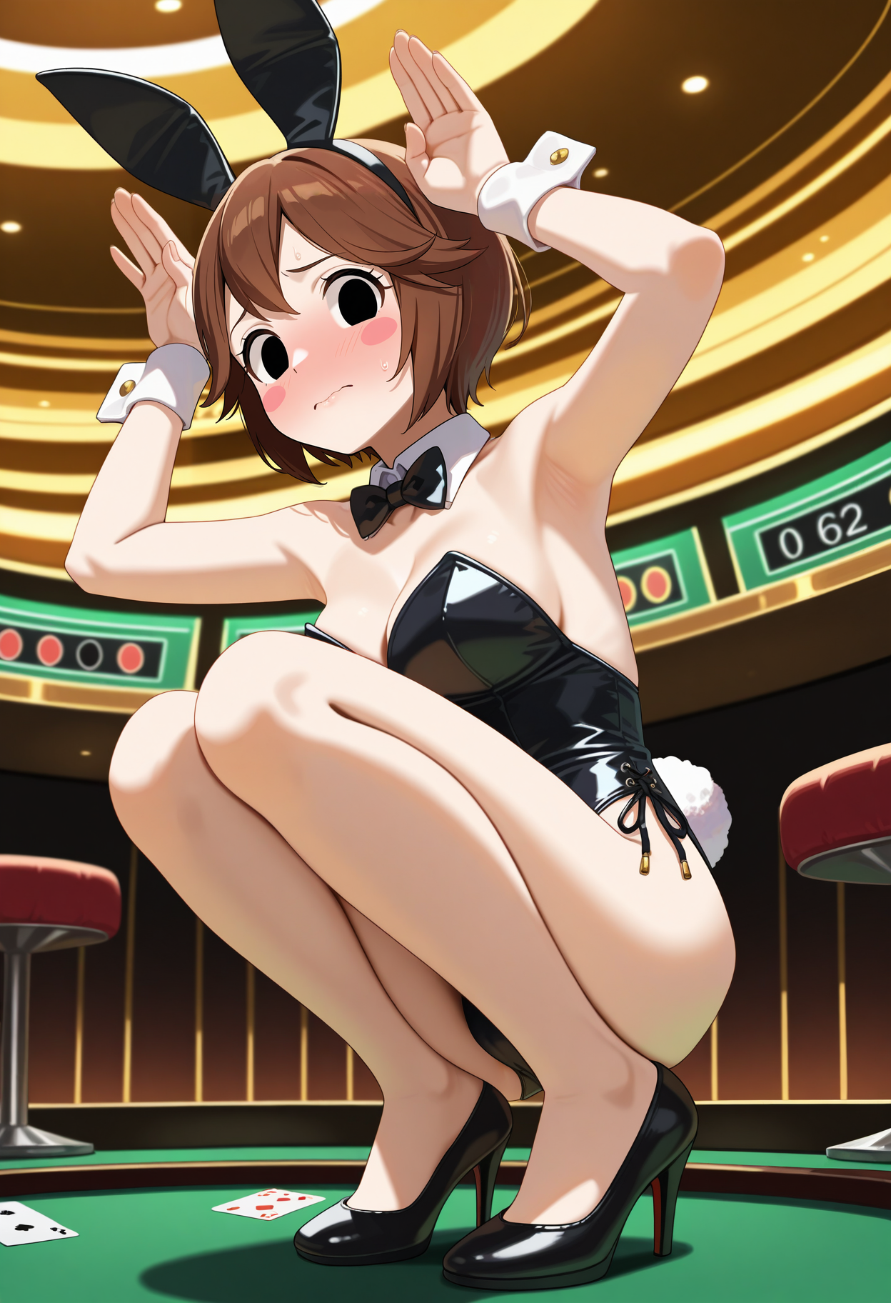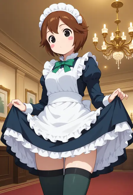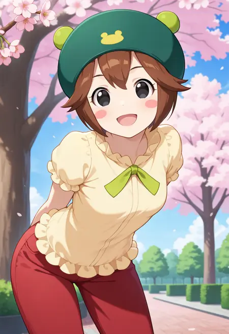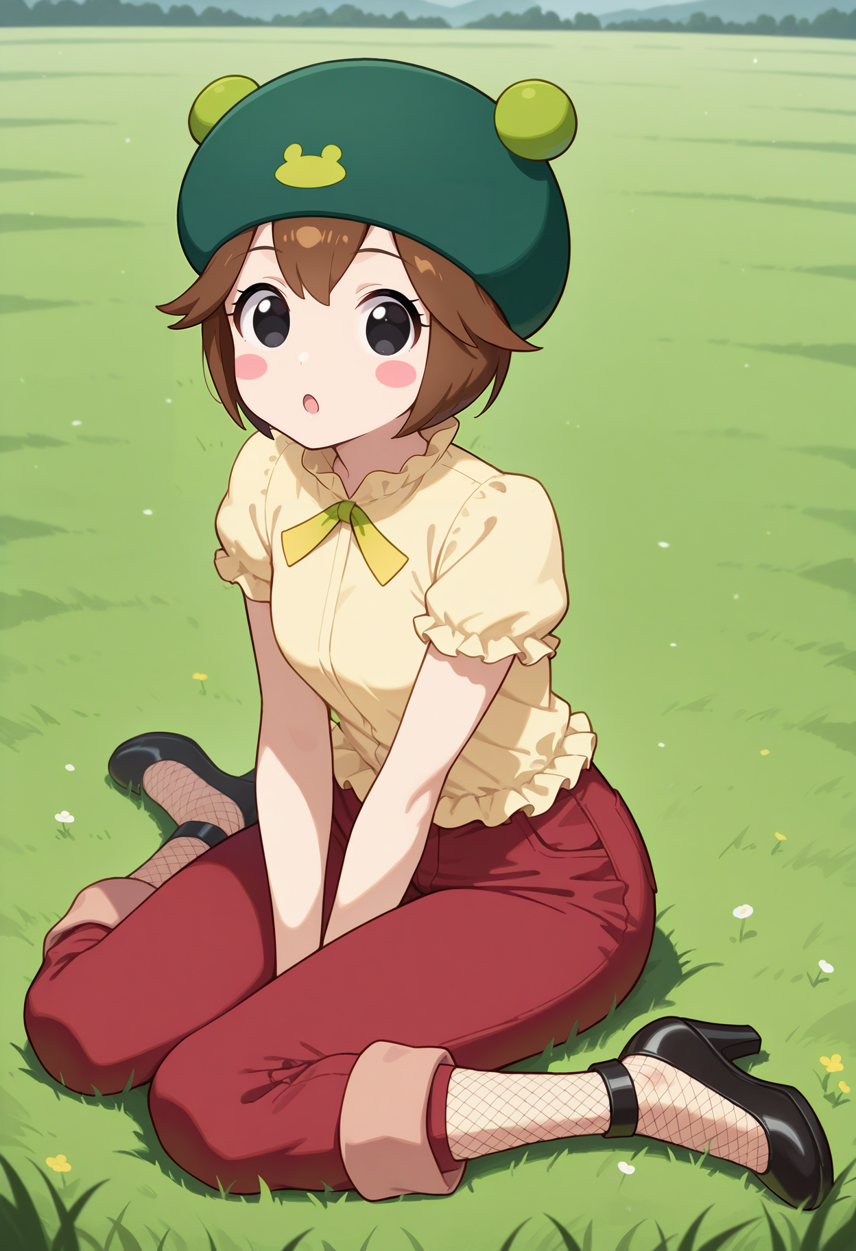 outfit2aakero, short hair, brown hair, hat, green headwear, black eyes, blush stickers, neck ribbon, frills, yellow shirt, short sleeves, red pants