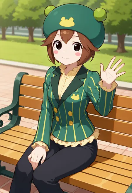 outfit1aakero, short hair, brown hair, hat, green headwear, black eyes, blush stickers, frills, yellow shirt, vertical-striped jacket, green jacket, long sleeves, black pants