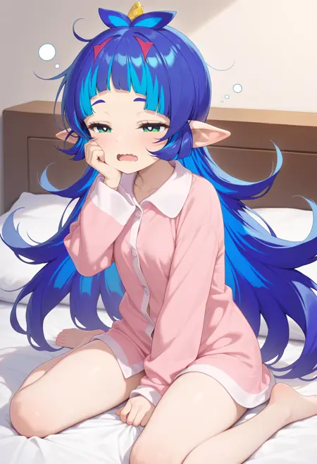 outfit2bbyasha, long hair, multicolored hair, blue hair, single horn, hair ornament, pointy ears, blunt bangs, green eyes, white ascot, white shirt, yellow jacket, long sleeves, pink skirt