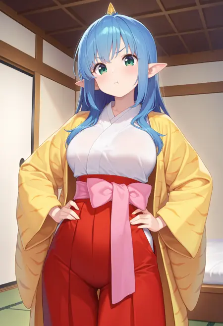 outfit1aayasha, long hair, blue hair, single horn, pointy ears, green eyes, breasts, white kimono, yellow haori, long sleeves, wide sleeves, sash, pink bow, hakama skirt, red hakama