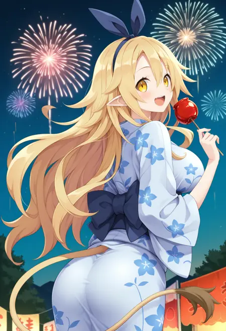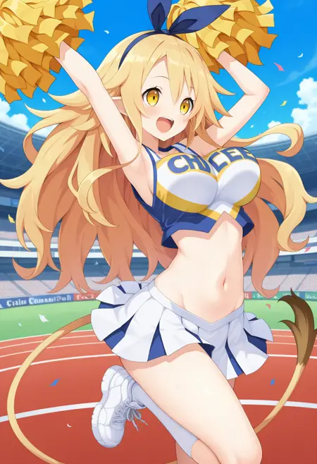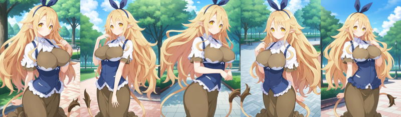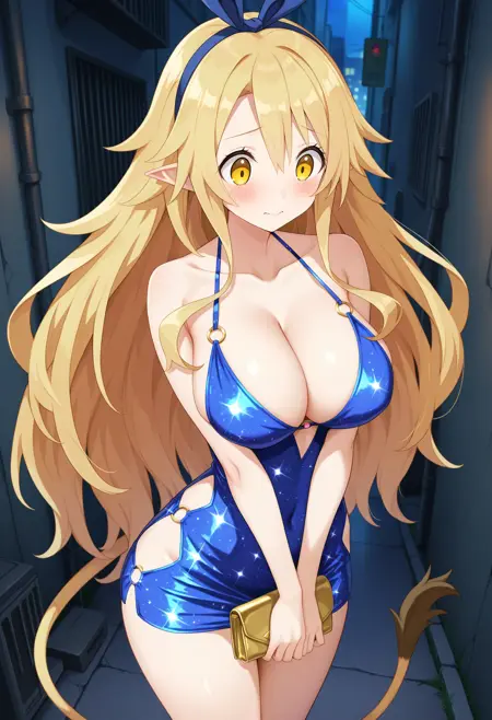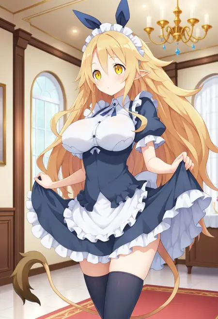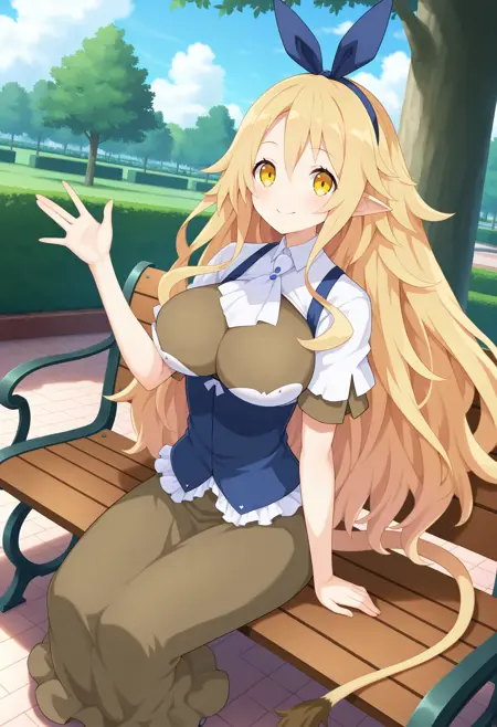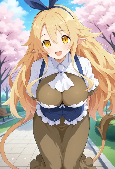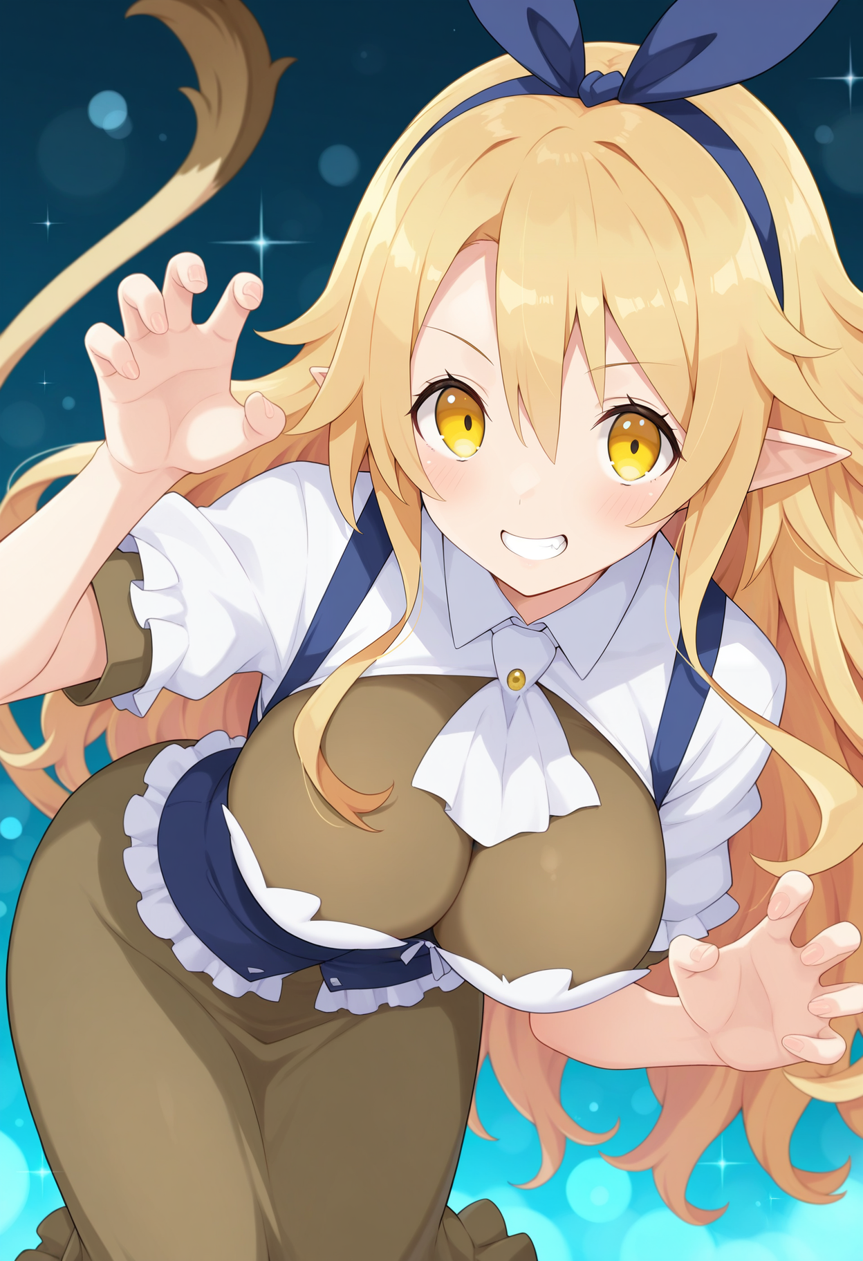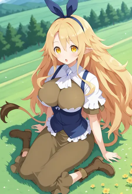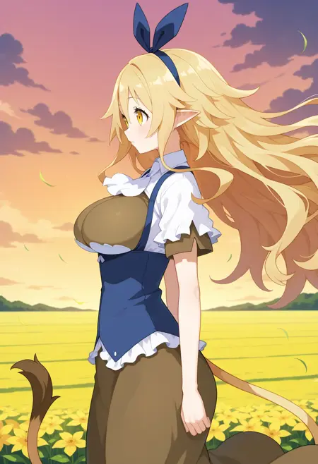 outfit1aalieze, long hair, blonde hair, hairband, hair ribbon, yellow eyes, pointy ears, large breasts, tail, white ascot, underbust, brown shirt, white shirt, blue vest, short sleeves, long skirt, brown skirt