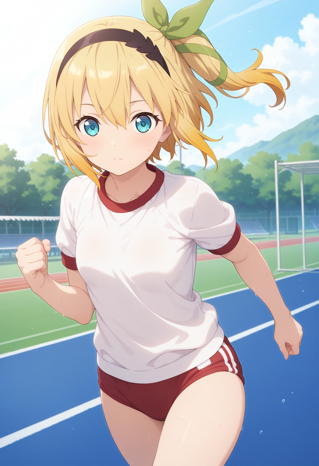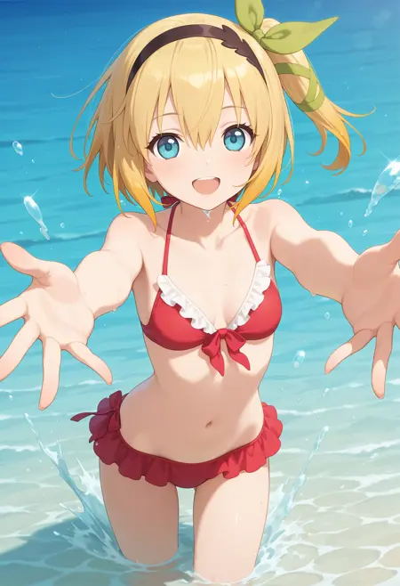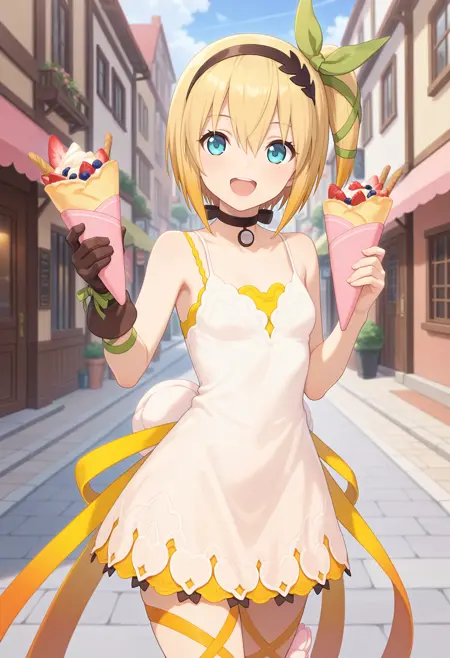 outfit1aaedna, short hair, blonde hair, side ponytail, hair ribbon, black hairband, blue eyes, small breasts, black choker, single glove, strap slip, white dress, brown gloves, leg ribbon, yellow ribbon
