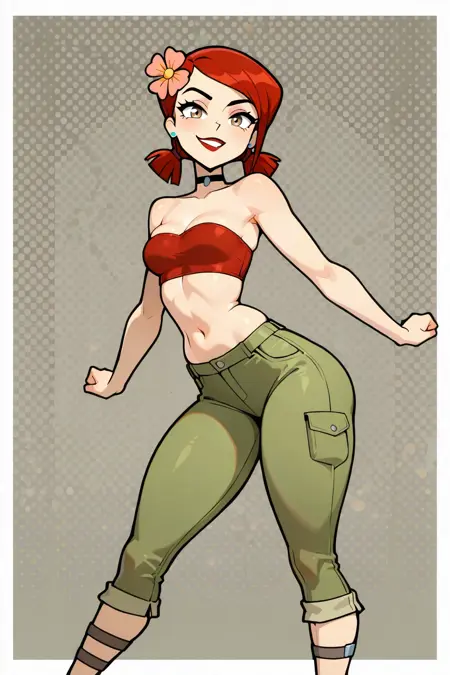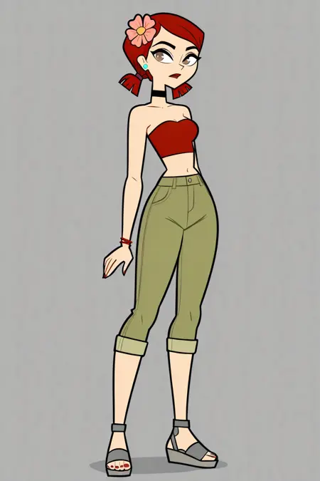 ZoeyTDROTI, 1girl, pale skinned, red hair, red tube top, greenish-khaki capri pants, choker, dark grey wedge sandals, low pig tails, flower in hair, light blue earrings, red lips, lipstick, light brown eyes, zoey (tdi)