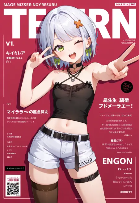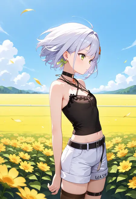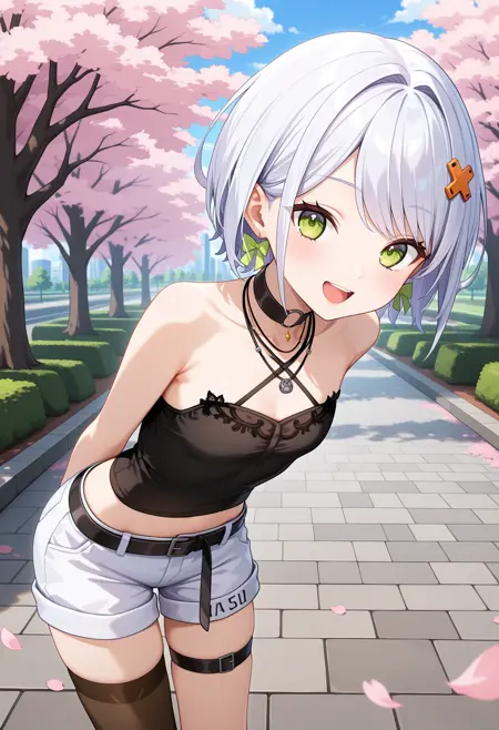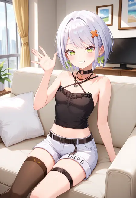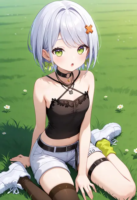 outfit2aasetsuna, short hair, white hair, hair ornament, earrings, green eyes, black choker, necklace, halterneck, black camisole, midriff, black belt, white shorts, thigh strap, single thighhigh