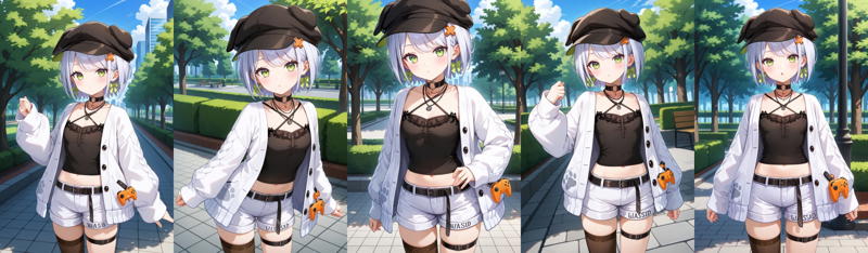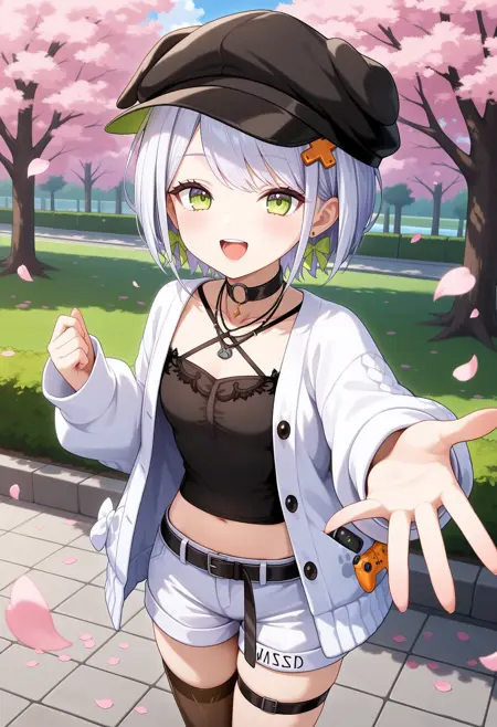 outfit1aasetsuna, short hair, white hair, cabbie hat, black headwear, hair ornament, earrings, green eyes, black choker, necklace, halterneck, black camisole, white cardigan, long sleeves, midriff, black belt, white shorts, thigh strap, single thighhigh