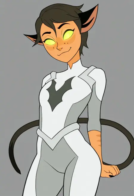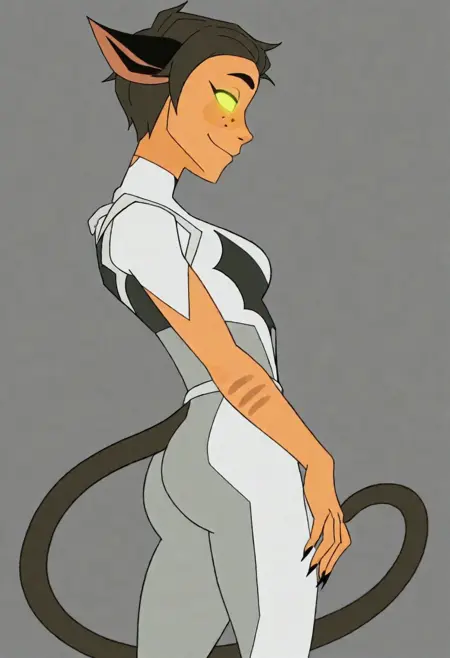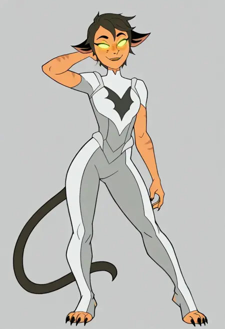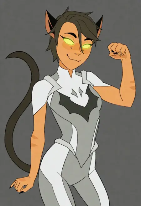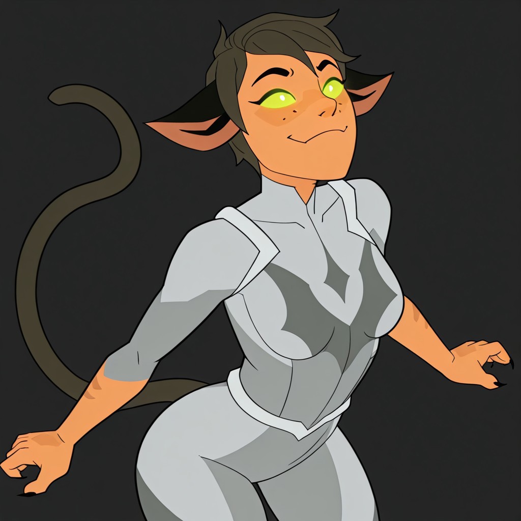 ホード・プライムに精神操作されたカトラ、プロンプト単語: Catra_Prime、短髪、後ろに流した髪、緑の目、光る目、単色の目、かわいい牙、趾開きソックス、白いチュニック、グレーのボディスーツ、ホルダックのシンボル