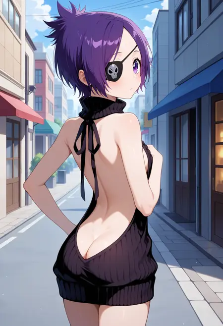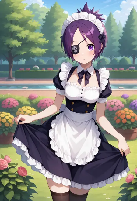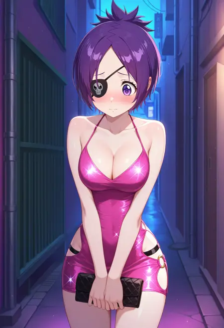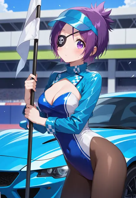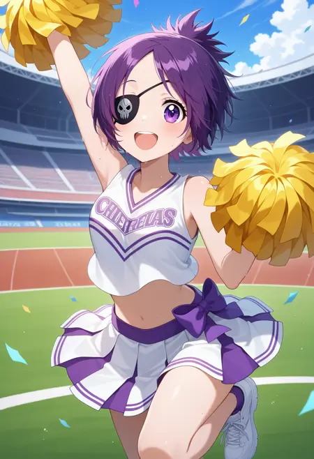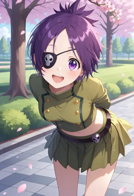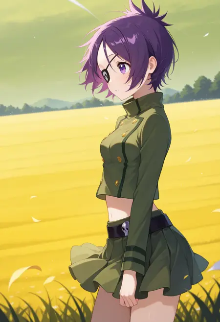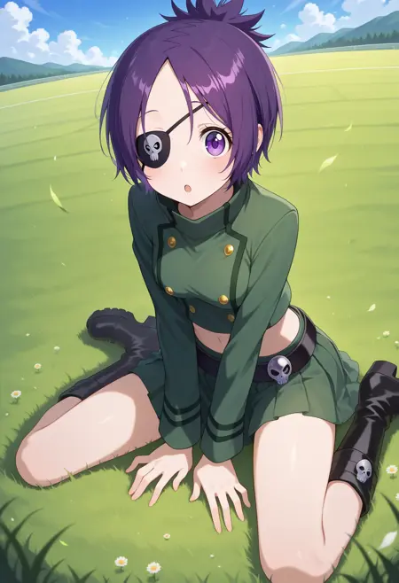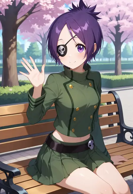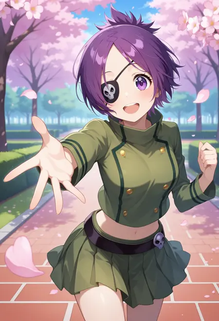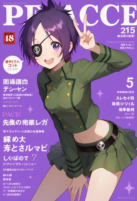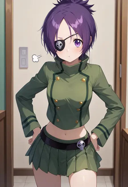 outfit1aadokuro, short hair, purple hair, eyepatch, purple eyes, green jacket, long sleeves, midriff, black belt, miniskirt, green skirt