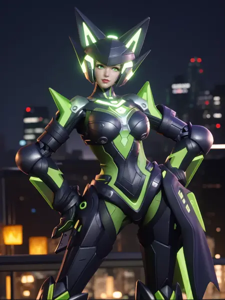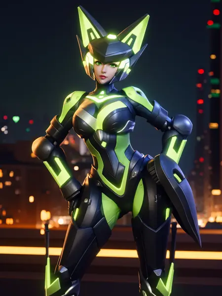 - WZRYsunshangxiangMRJJ, 1girl, solo, green eyes, helmet, power armor, glowing, lips, standing, cityscape, night, mature female, looking at viewer, hand on hip, cowboy shot,