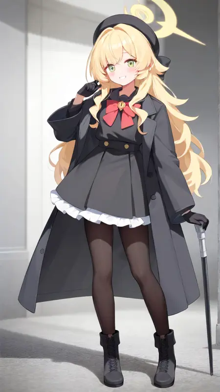 示例提示:"professor_niyaniya_blue_archive, 一位动漫女孩, 1girl, 单人, 长发, 望着观众, 脸红, 微笑, 刘海, 裙子, 金发, 简单背景, 衬衫, 手套, 长袖, 帽子, 白色背景, 蝴蝶结, 拿着, 绿色眼睛, 站立, 全身, 连裤袜, 靴子, 花边, 开放式服装, 黑色手套, 领结, 黑色鞋履, 外套, 黑色连裤袜, 黑色头饰, 光环, 花边裙子, 黑色外套"