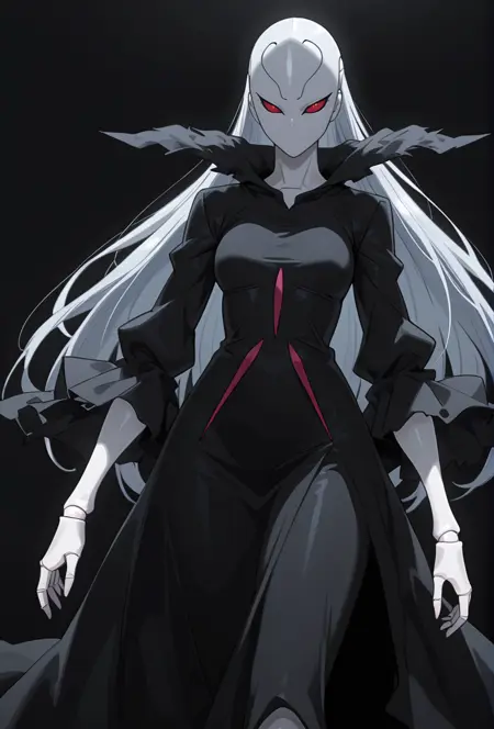 beretacnn,1girl, long hair,red eyes, (mask:1.1), black dress,silver hair, doll joints, no humans, no mouth,
