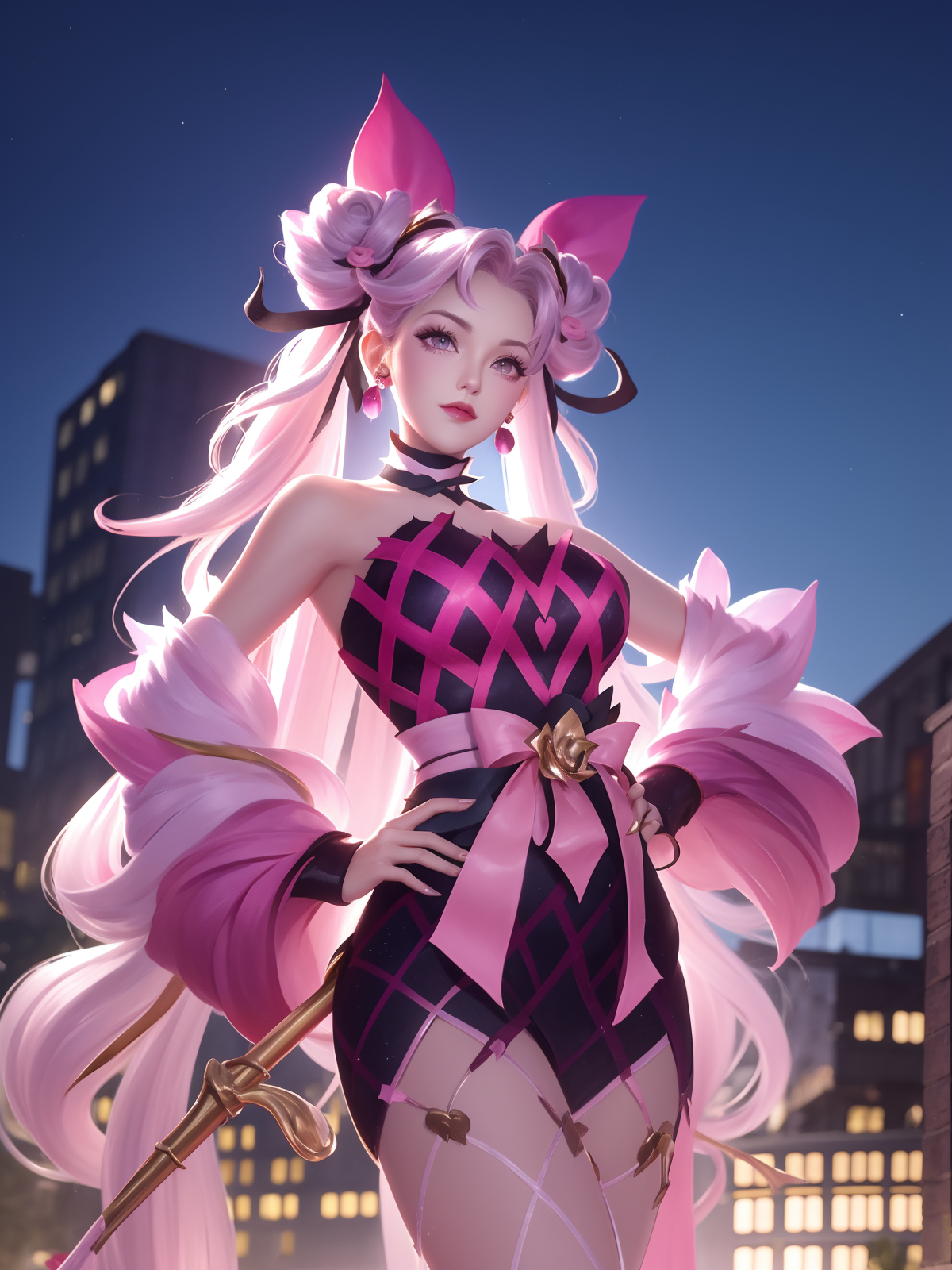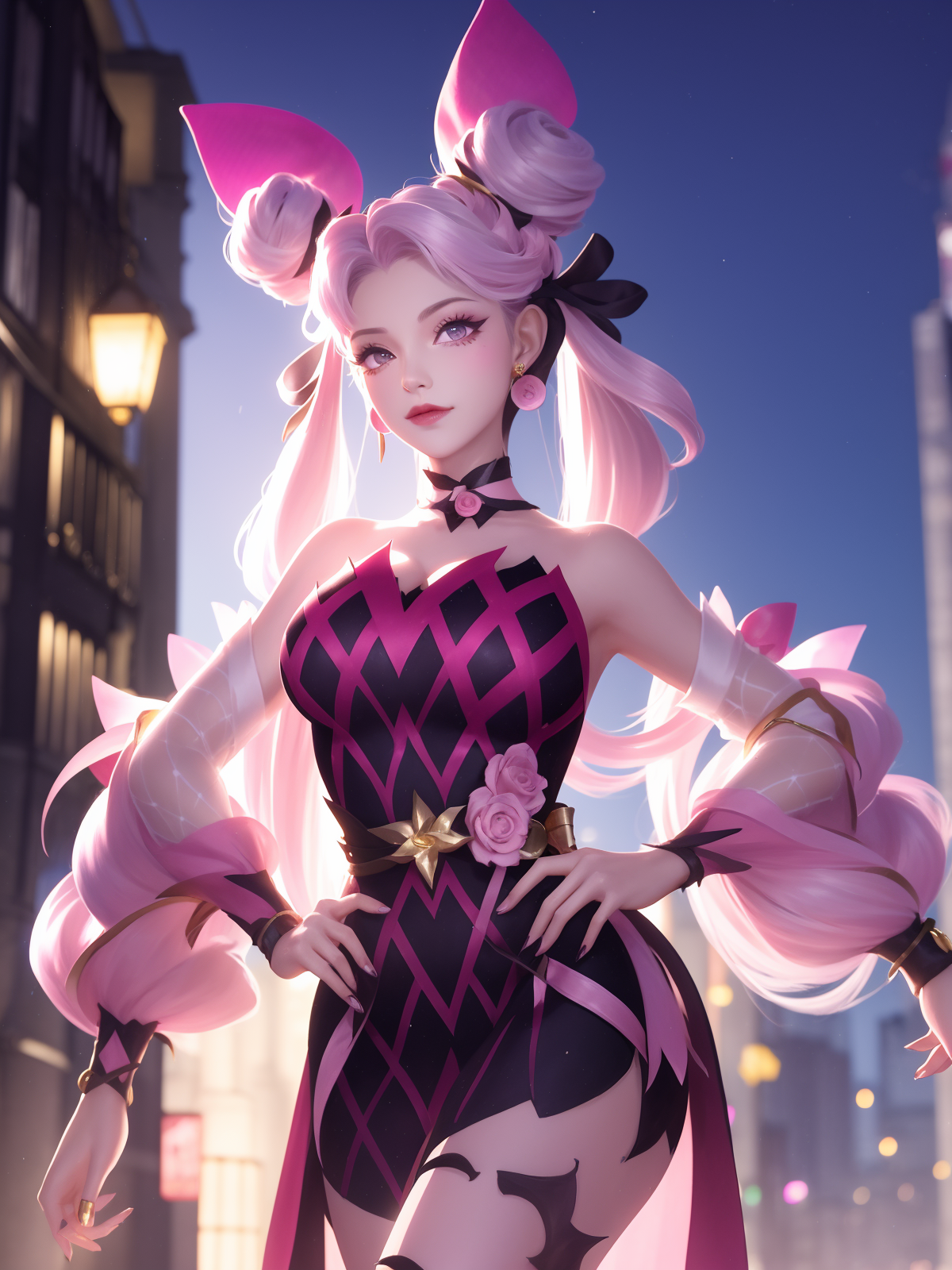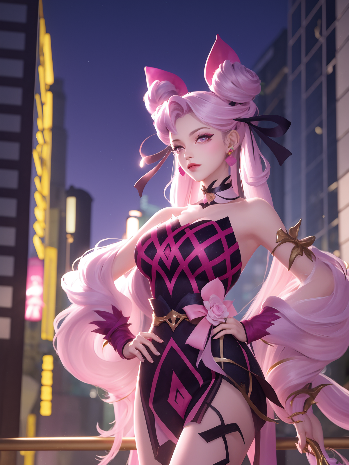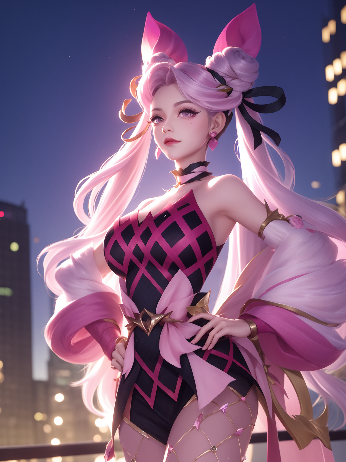 - WZRYsunshangxiangQWLR, 1girl, solo, double bun, choker, pink hair, jewelry, facial mark, fishnets, earrings, pink eyes, twintails, bow, hair ornament, bare shoulders, long hair, ribbon, lipstick, pink dress, detached sleeves, cityscape, night, mature female, looking at viewer, standing, hand on hip,