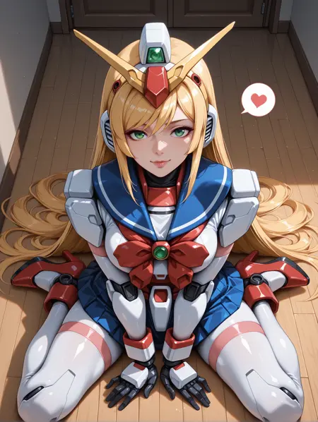 nobel gundam, gf13-050nsw, solo, robot, mecha, v-fin, gundam helmet, mechaincal face, long hair, mecha, blonde hair, red bow, bow, high heels, blue sailor collar, sailor collar