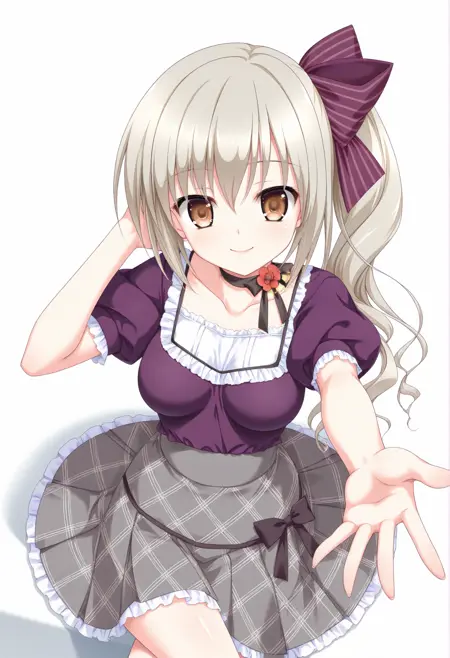 purple shirt,plaid skirt,pleated skirt,puffy short sleeves,frilled sleeves,ribbon choker,black choker,neck flower,red flower,grey skirt,white frills,frilled skirt,bow skirt,
