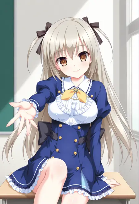 school uniform,juliet sleeves,puffy long sleeves,frilled sleeves,back bow,black bow,white shirt,collared shirt,frilled collar,frilled shirt,yellow bowtie,double-breasted,blue skirt,miniskirt,high-waist skirt,frilled skirt,