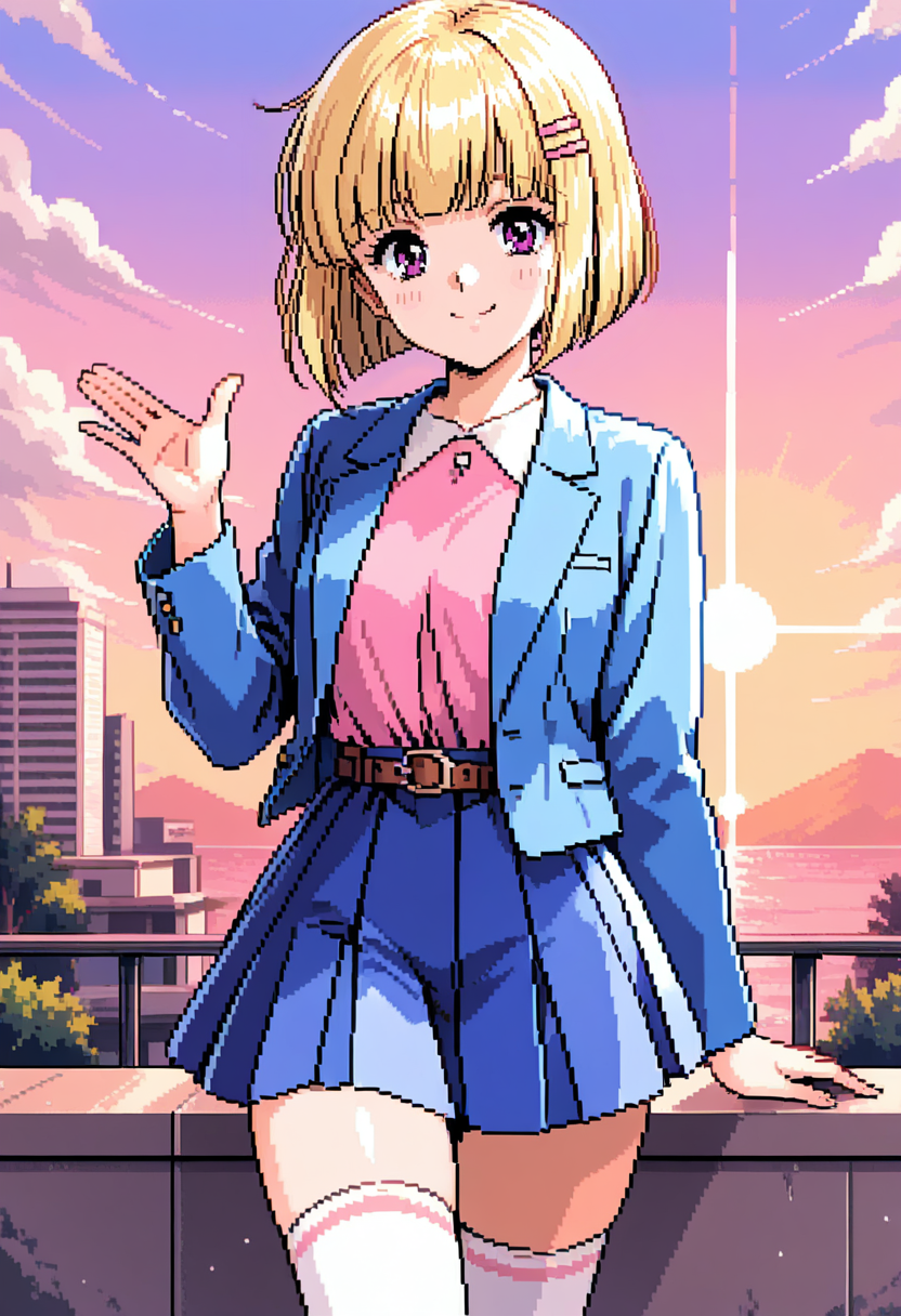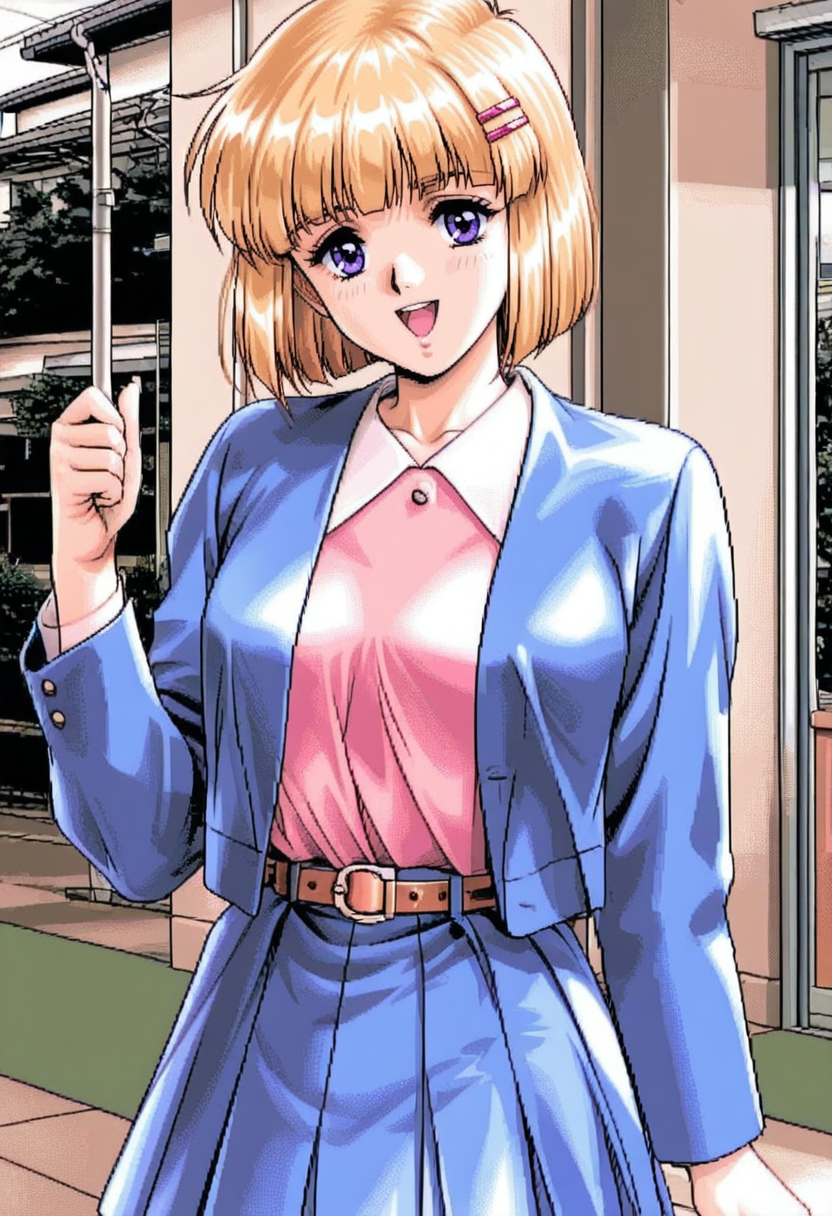 服: "ピンクのシャツ、カレッジシャツ、ベルト、青スカート、青ジャケット"