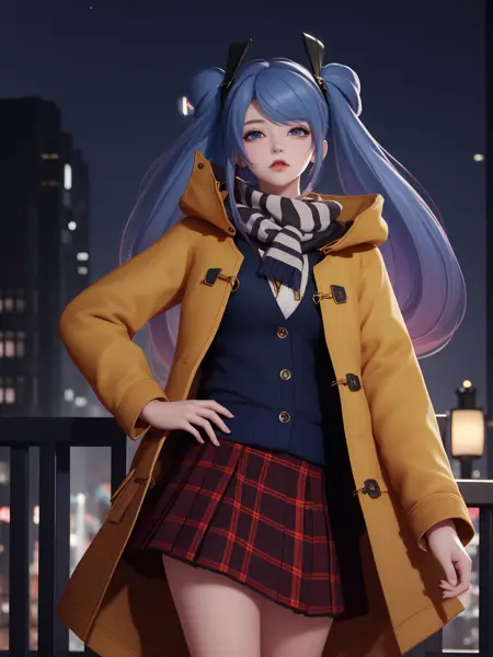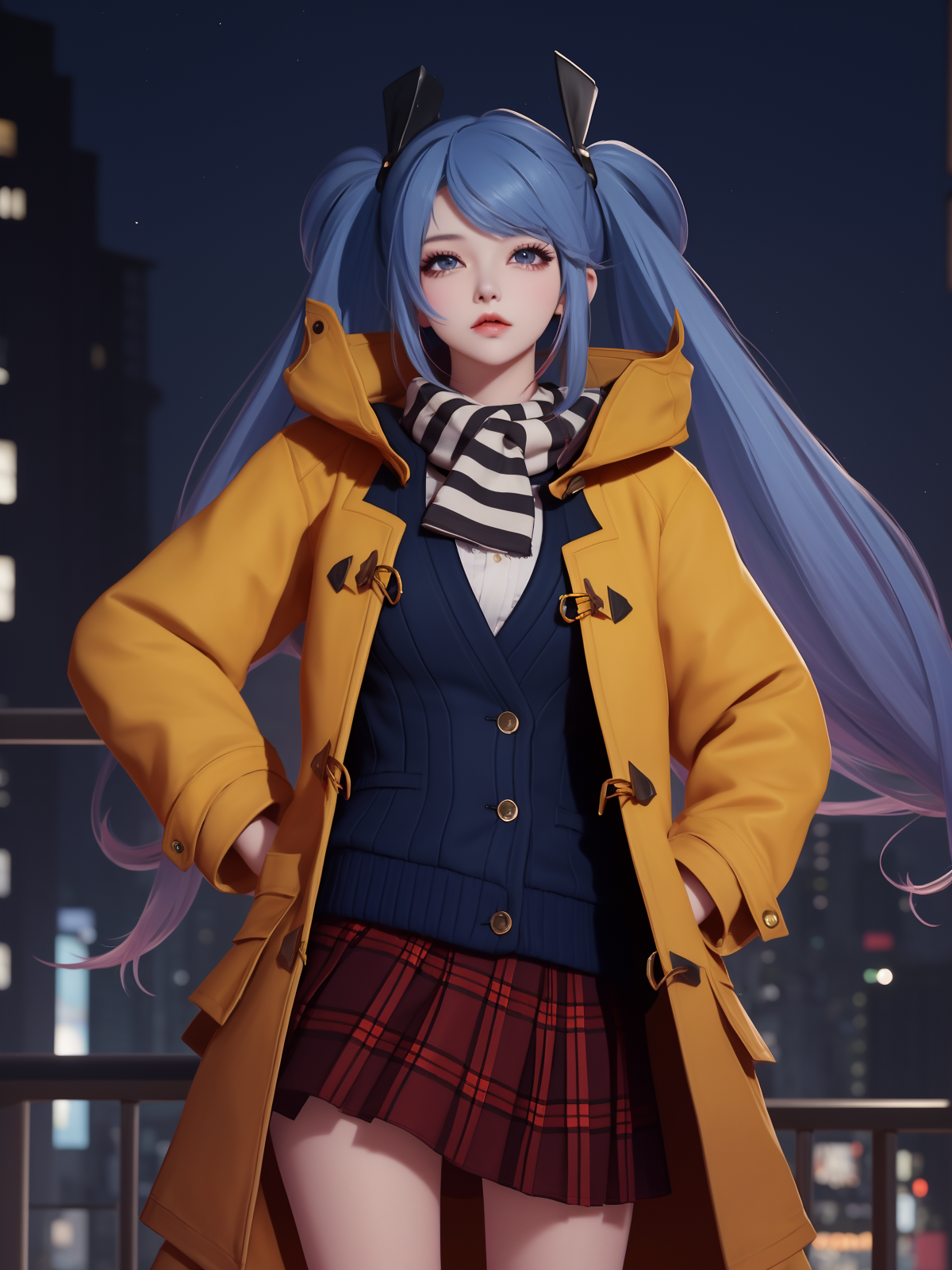 - WZRYsunshangxiangSZLR, 1girl, solo, long hair, blue eyes, twintails,parted lips, plaid skirt,coat,scarf, vest,blue hair,looking at viewer, cityscape, night, mature female, standing, hand on hip, multicolored hair,