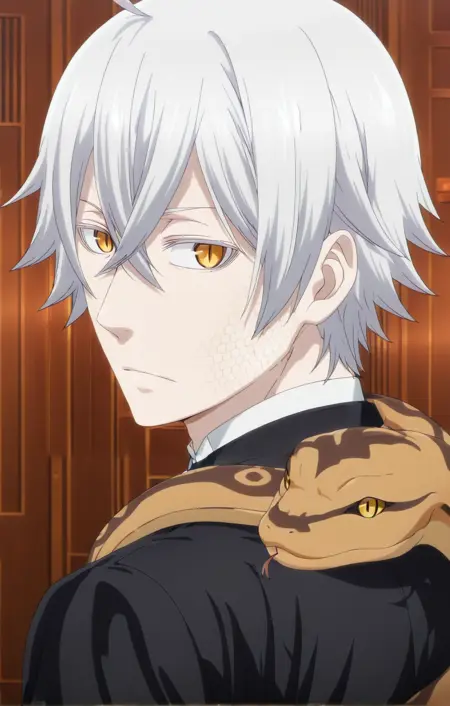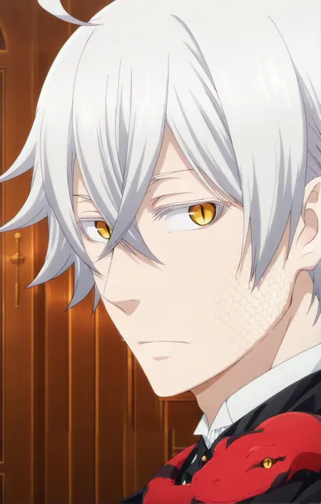 snakke, snake_butler, 흰 머리, 눈 사이의 머리카락, 노란 눈, ahoge, 수직 동공, 비늘,