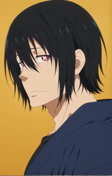 benimaru, benimaru shinmon, black hair, hair between eyes, red eyes, symbol-shaped pupils,