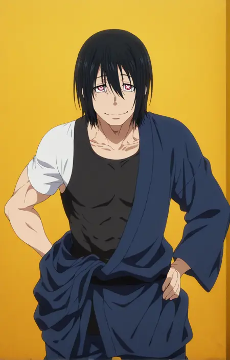 japanese clothes, layered clothes, shirt under shirt, white t-shirt, black tank top, shirt under kimono, asymmetrical clothes, long sleeve, blue pants, blue kimono, black boots,