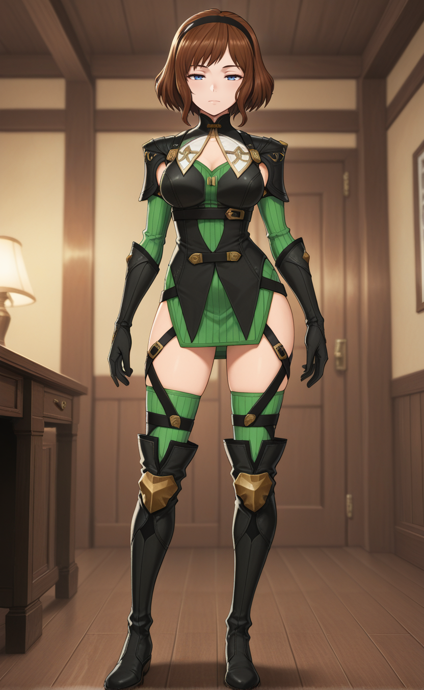 1girl,w1zardryopher1,solo, brown hair,short hair,blue eyes, breasts,medium breasts, gloves, thighhighs, ribbed legwear, hairband, green thighhighs, dress,indoors,room,looking at viewer,smile,best quality,masterpiece,sensitive, lora:WizardryOpheriaNoobAI:1
