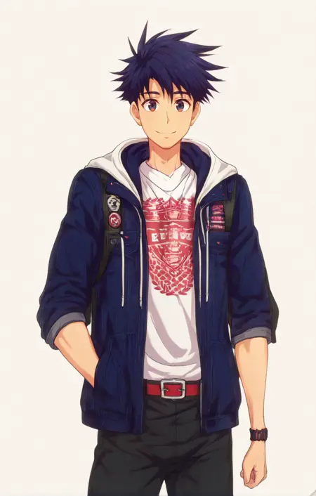 white shirt, blue hoodie, hood down, open hoodie, black pants, white shoes, red belt,