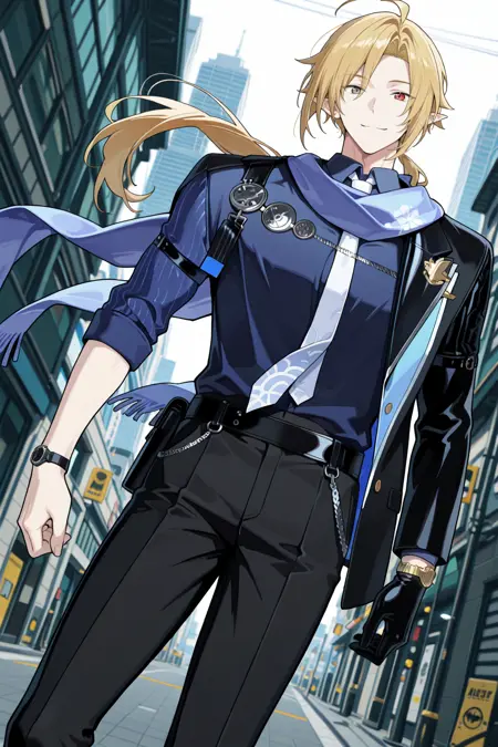 official alternate costume, collared shirt, necktie, black pants, scarf, single glove, wristwatch
