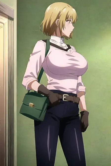 살테린: saltherine, solo focus, gloves, pink shirt, black pants, brown belt, collarbone, shoulder bag, strap between breasts, ...