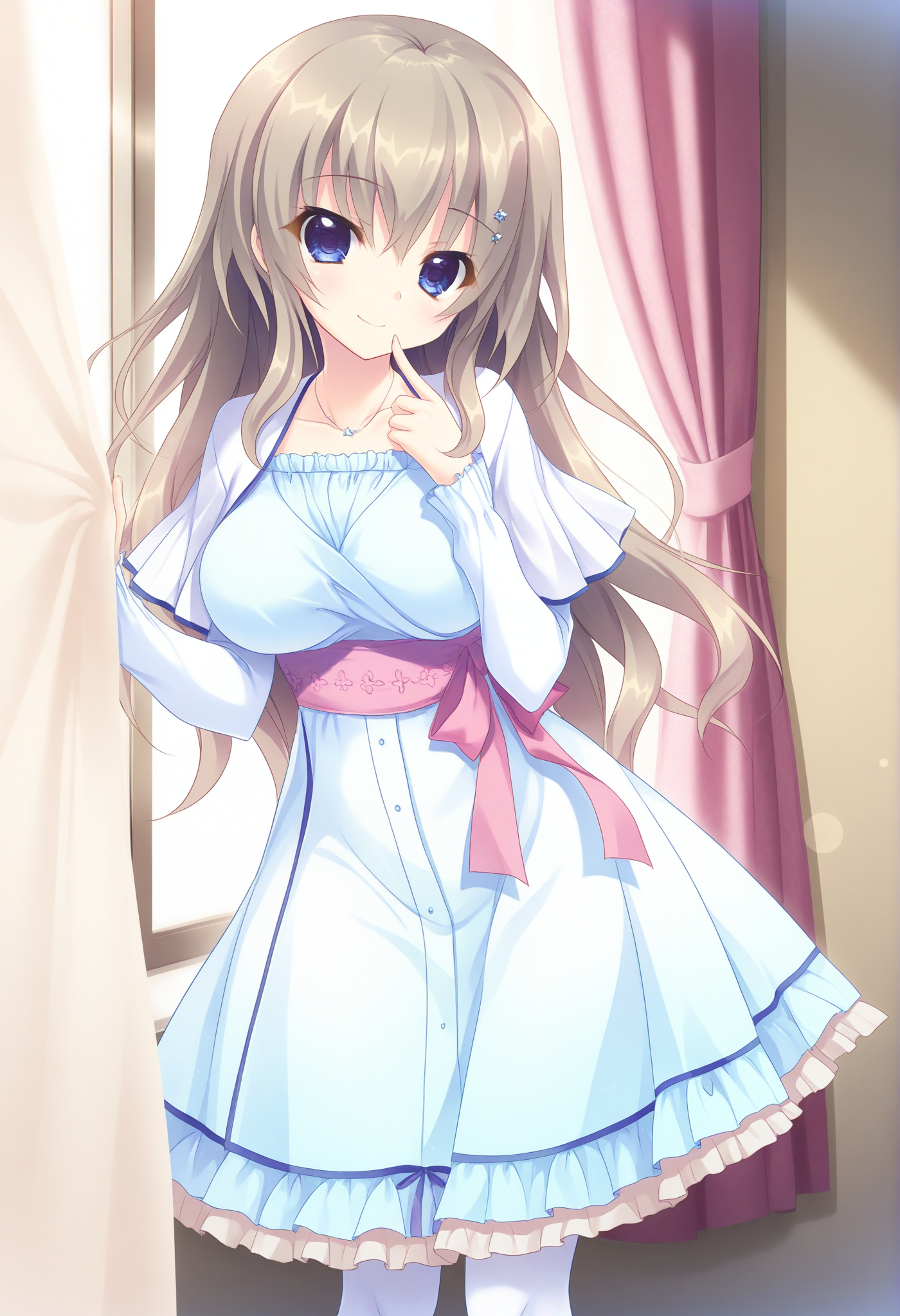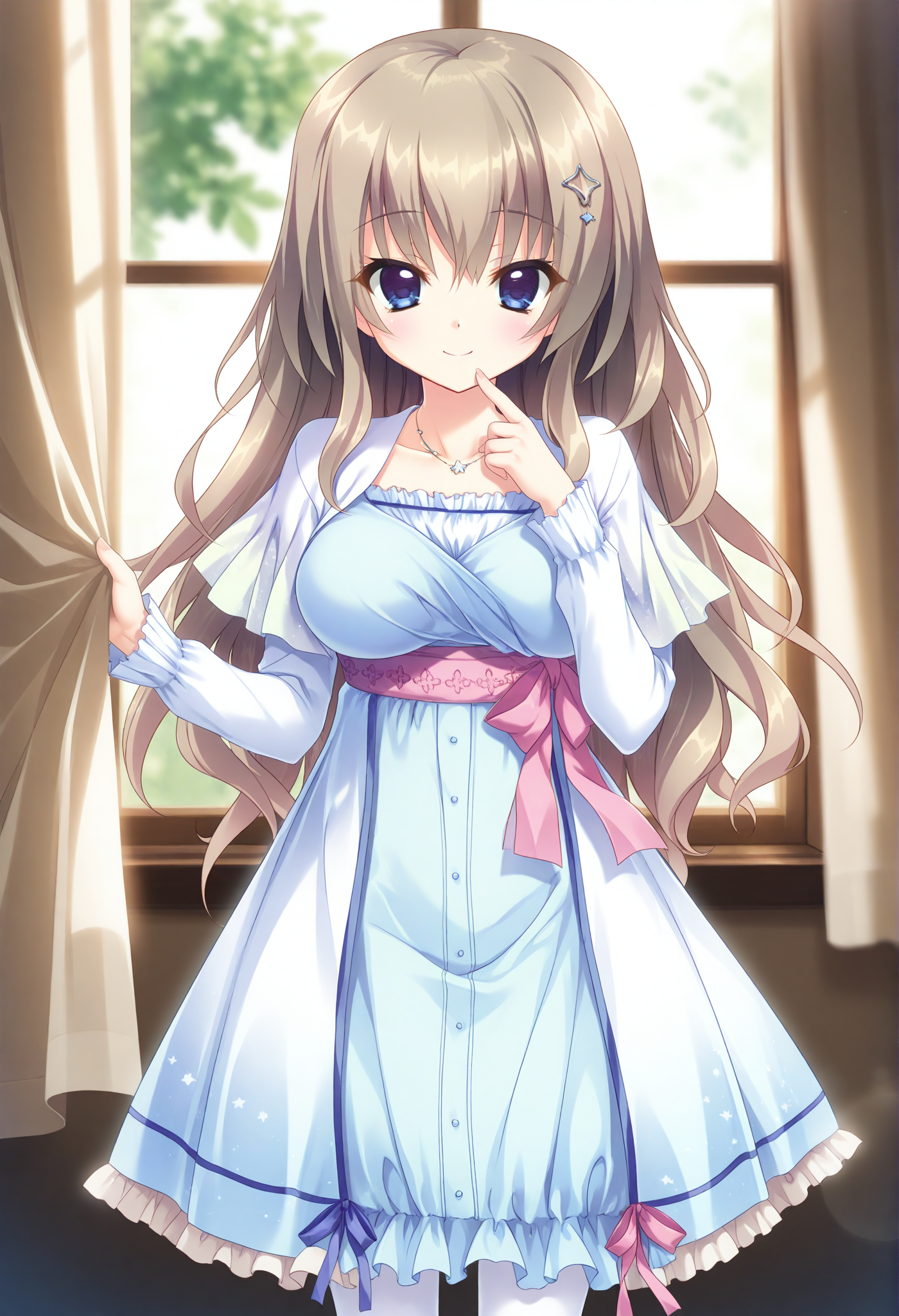 star hair ornament,casual,blue dress,long sleeves,white pantyhose,frilled dress,white dress,star necklace,white capelet,pink sash,pink bow,waist bow,