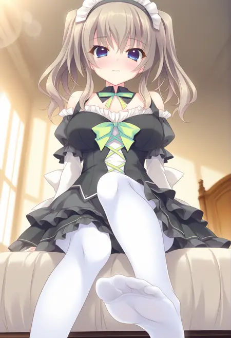 maid,twintails,black dress,maid headdress,frills,white pantyhose,bow,long sleeves,frilled dress,detached sleeves,bare shoulders,detached collar,puffy sleeves,