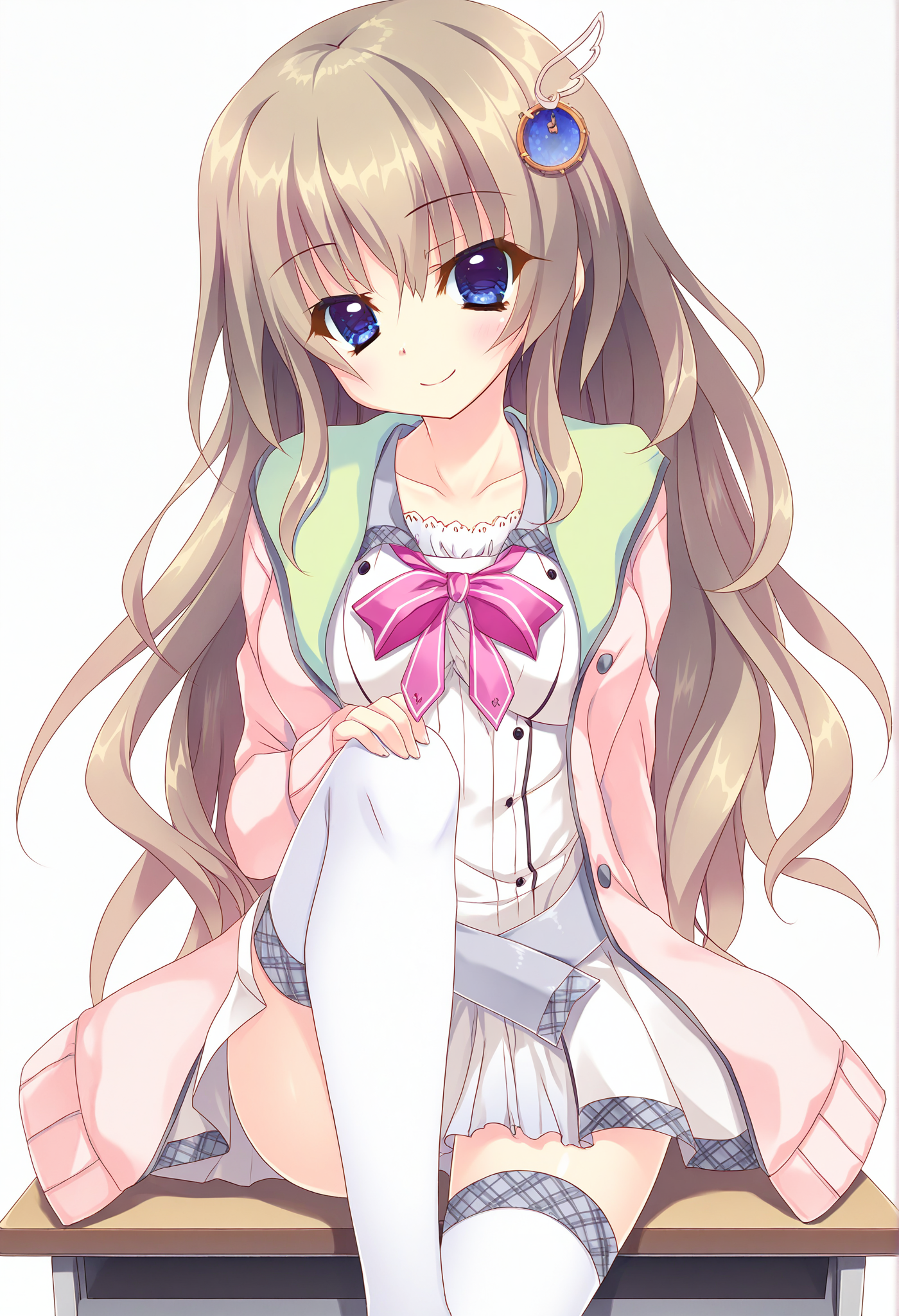 school uniform,white thighhighs,pink cardigan,zettai ryouiki,white dress,collarbone,open clothes,open cardigan,pink jacket,short dress,frills,pink ribbon,pink bow,sidelocks,open jacket,long sleeves,