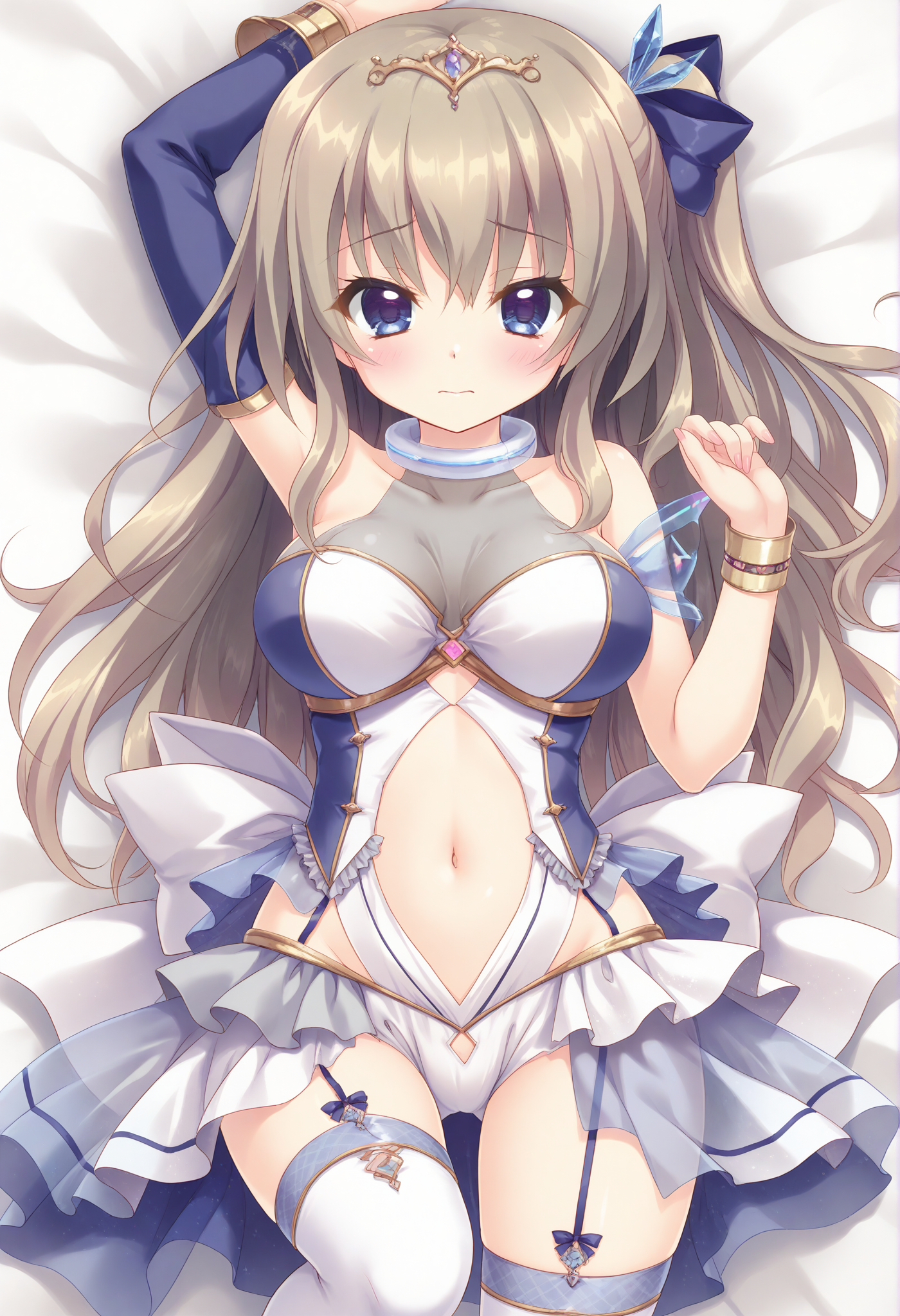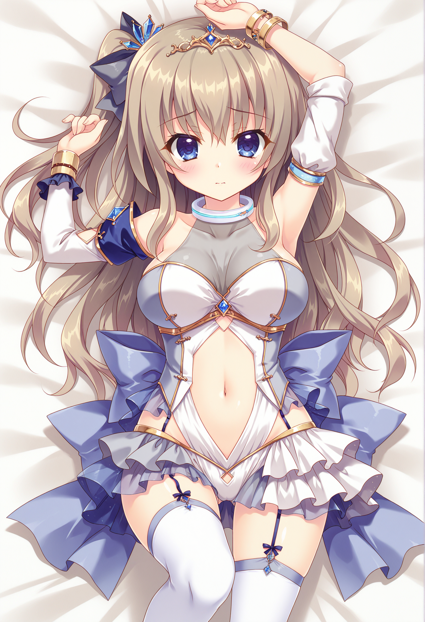 one side up,tiara,hair bow,garter straps,jewelry,navel cutout,detached sleeves,white thighhighs,white collar,grey tank top,single sleeve,layered skirt,blue skirt,see-through skirt,gold bracelet,two-tone leotard,back bow,revealing clothes,white skirt,