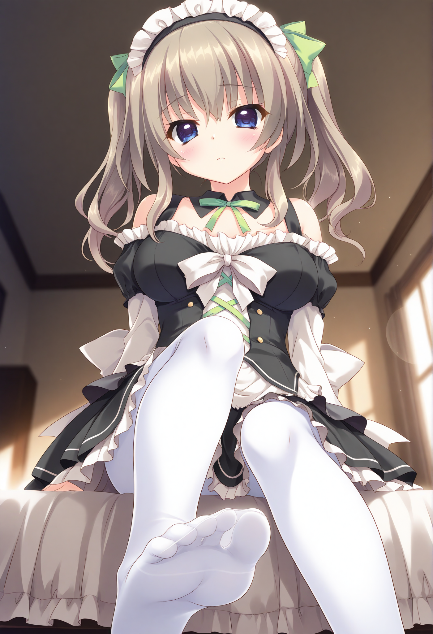twintails,maid,maid headdress,white pantyhose,black dress,long sleeves,detached sleeves,detached collar,black collar,frilled dress,layered dress,white frills,black frills,white sleeves,frilled sleeves,layered sleeves,short over long sleeves,white shirt,frilled shirt,back bow,white bow,green ribbon,chest bow,green bow,off-shoulder dress,off-shoulder shirt,